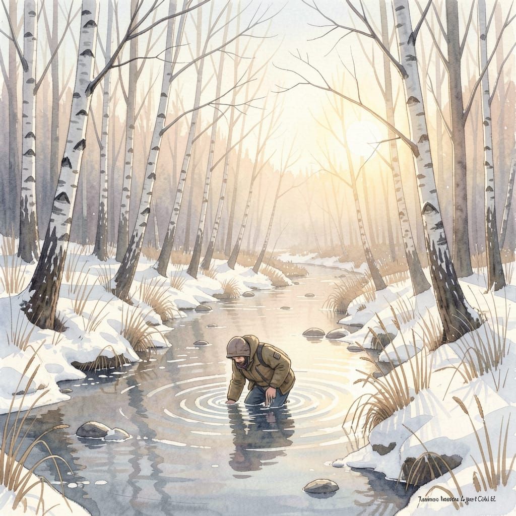 This watercolor landscape captures a lone wanderer in a birch forest during spring snowmelt. A pale sun illuminates the creek and willows.