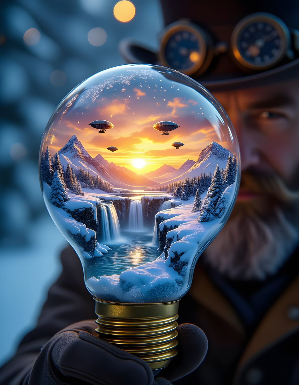 This hyperreal image shows a steampunk inventor holding a lightbulb containing a miniature, frozen ice world with blimps and waterfalls at sunset.