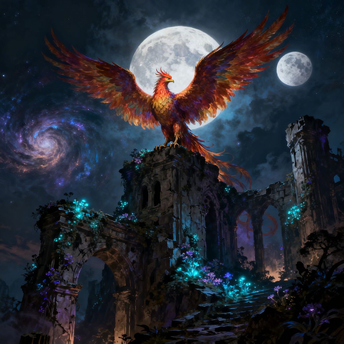 This image shows a majestic phoenix resting on ancient ruins covered in glowing plants, set against a twin moonlit sky with nebulae. Epic fantasy concept art with atmospheric lighting.