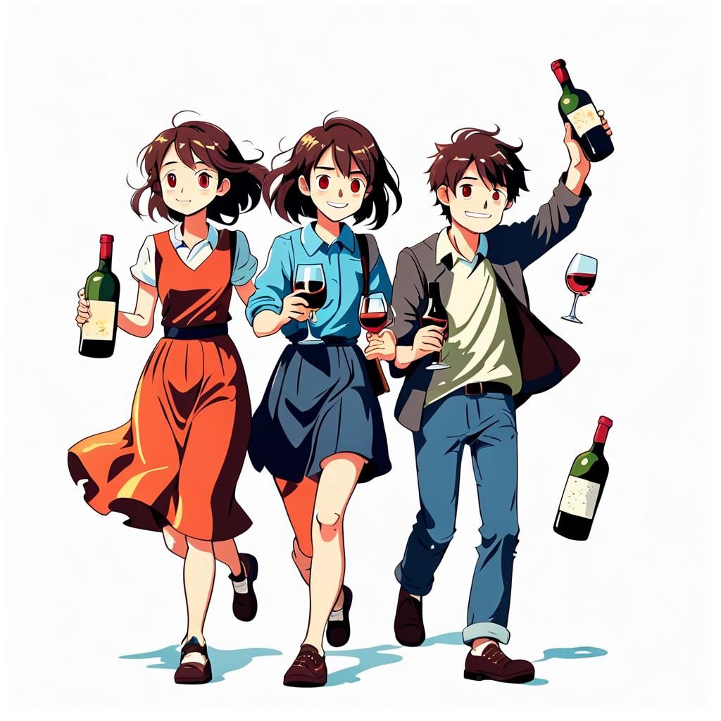 This image shows a cartoon-style illustration of people with alcohol. The figures, both men and women, are depicted with wine bottles. The artwork is reminiscent of anime key visuals.