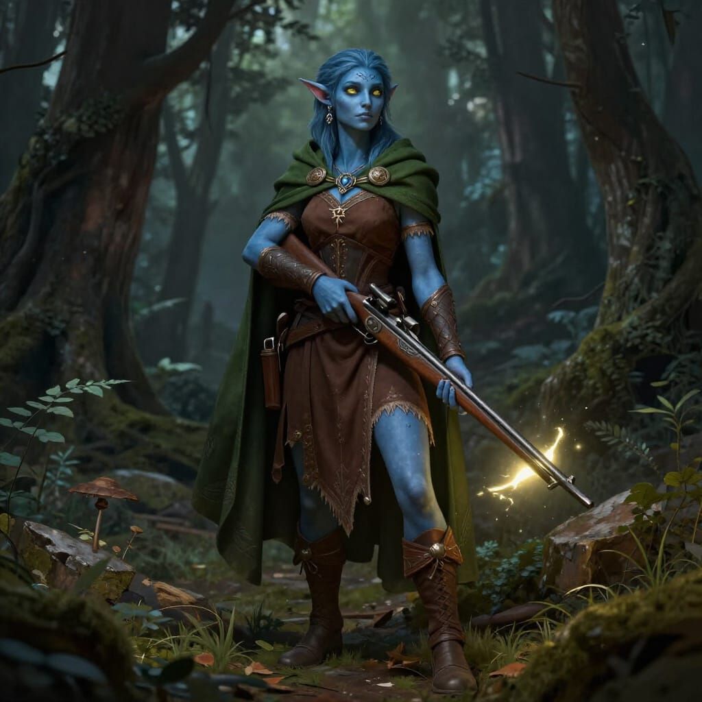 A fantasy concept art piece showing a blue-skinned tiefling ranger with a glowing crossbow, set against a detailed, deep-colored dark forest. Rendered in 8k with intricate detail.