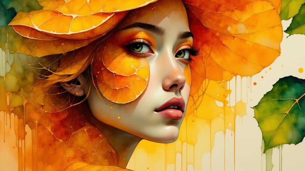 A vibrant portrait of a woman whose skin resembles a ripe mango, rendered in liquid ink watercolor. Her features echo the fruit's flesh and seeds, set against a tropical blur with golden hour lighting.