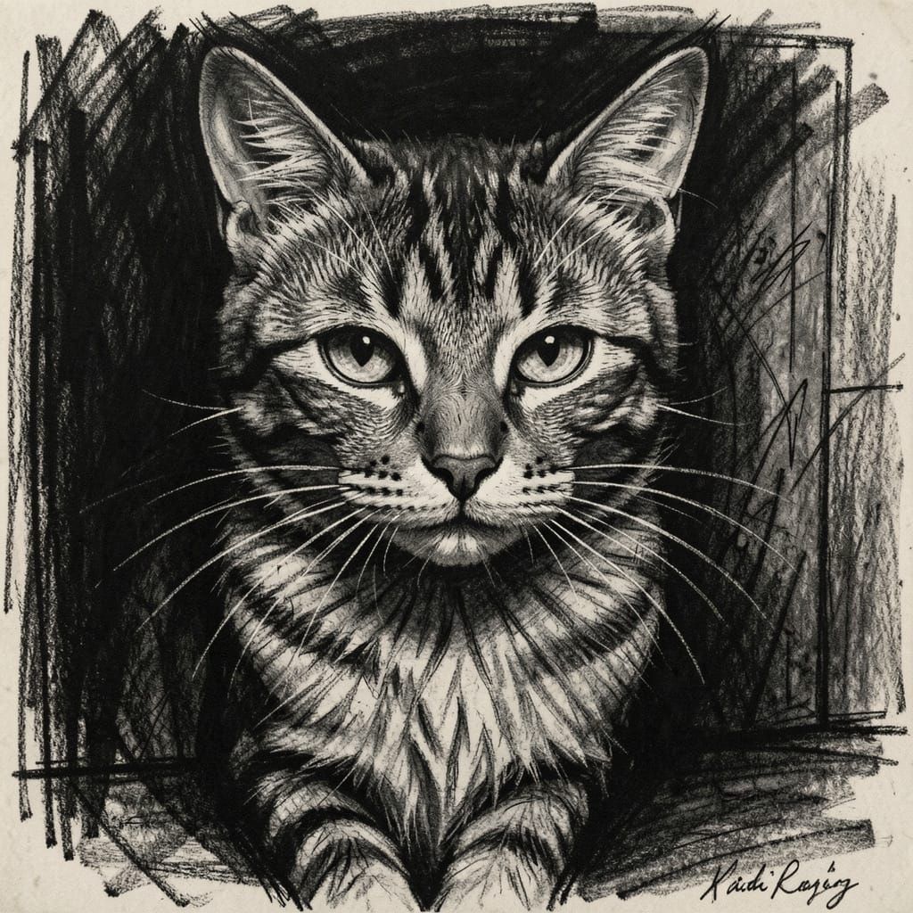 This image is a hyperdetailed charcoal drawing of a cat, featuring masterful shading and dramatic light and dark contrasts to evoke intense emotion.