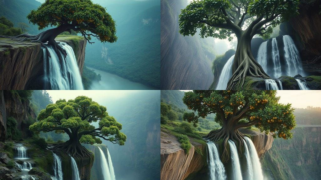This image shows a breathtaking landscape featuring a majestic fruit tree on a cliff's edge, surrounded by four roaring waterfalls that seem to spring from its roots. Shot in a cinematic aesthetic with film grain and vibrant color grading, this scene is a masterpiece of atmospheric drama.