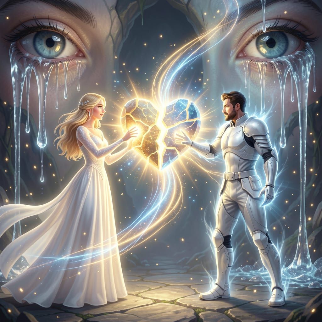 A radiant magical woman in a flowing white dress and a handsome man in a gleaming white armored suit stand facing each other, both gently holding the two halves of a shattered glowing heart that crackles with golden and blue light between them. Swirling streams of magical energy connect their hands to the broken heart as if they are healing it together. In the background, two enormous ethereal eyes weep crystal tears that cascade down like waterfalls, watching over this deeply emotional and magical moment β a powerful scene of two souls mending what was once broken