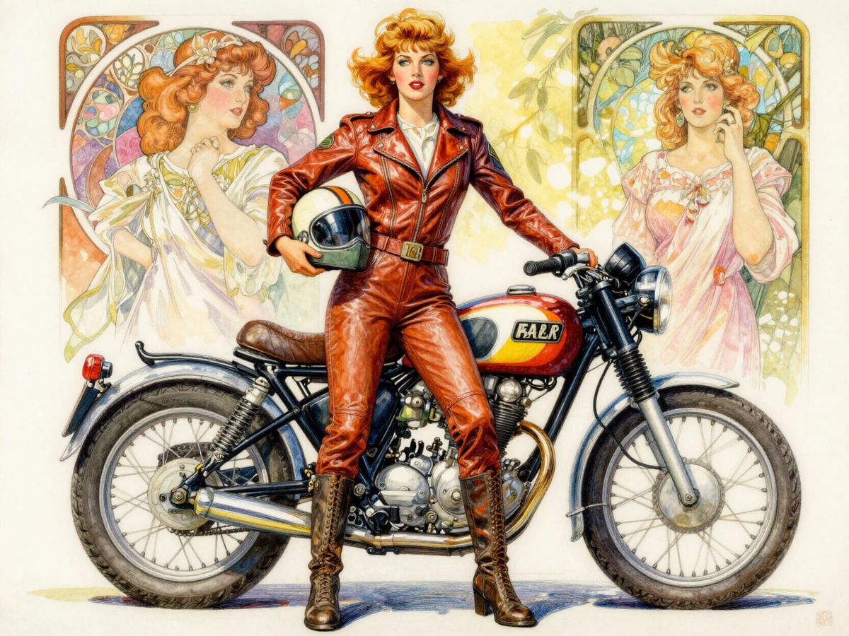 A vibrant mixed-media artwork of a 1960s woman in leather gear beside her motorcycle. Features loose watercolor brushstrokes and detailed color pencil textures with vivid, saturated colors.