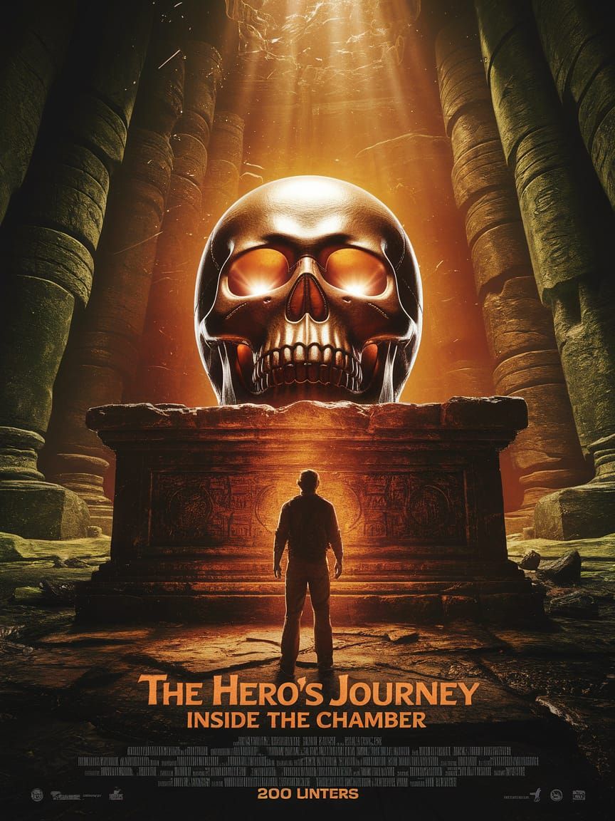 "The Hero's Journey: Inside the Chamber." A movie poster. Hyperrealistic. What have the adventurers found? Is it a secret?, is it treasure?