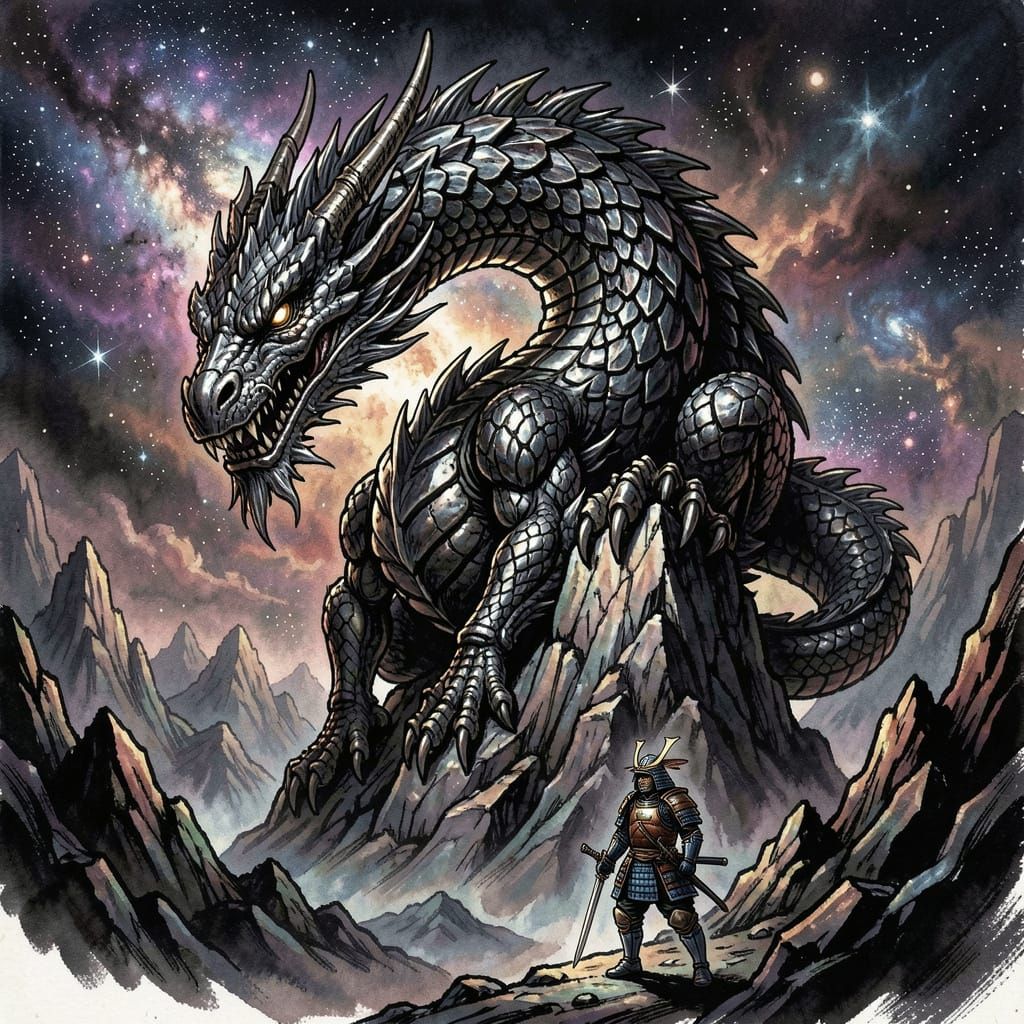 This concept art features a massive iron dragon on a cosmic mountain, observed by a samurai. It combines Japanese ink wash and surrealist styles with dramatic lighting.