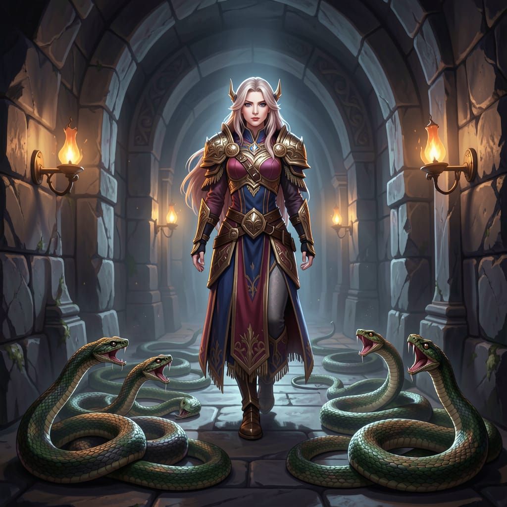 This concept art portrait depicts a heroic warrior venturing into a shadowy tunnel, encountering a floor covered in hissing serpents. Rendered in a detailed, dynamic style with volumetric lighting.