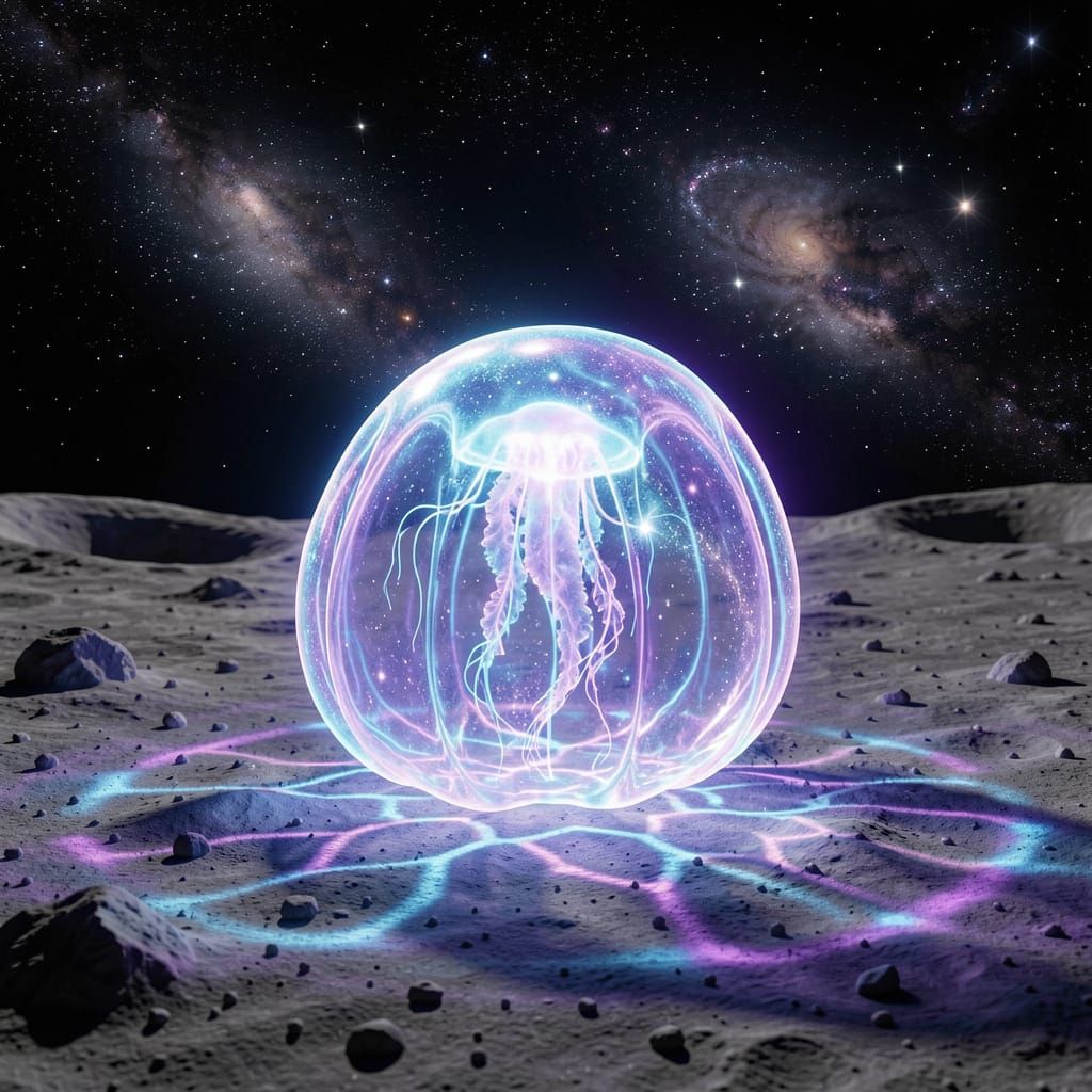 This image shows a glowing, jelly-like alien fruit resembling a cosmic jellyfish on the moon's surface. It emits neon blue and purple light against a starry sky, rendered in a surreal, dreamlike art style with cinematic lighting.