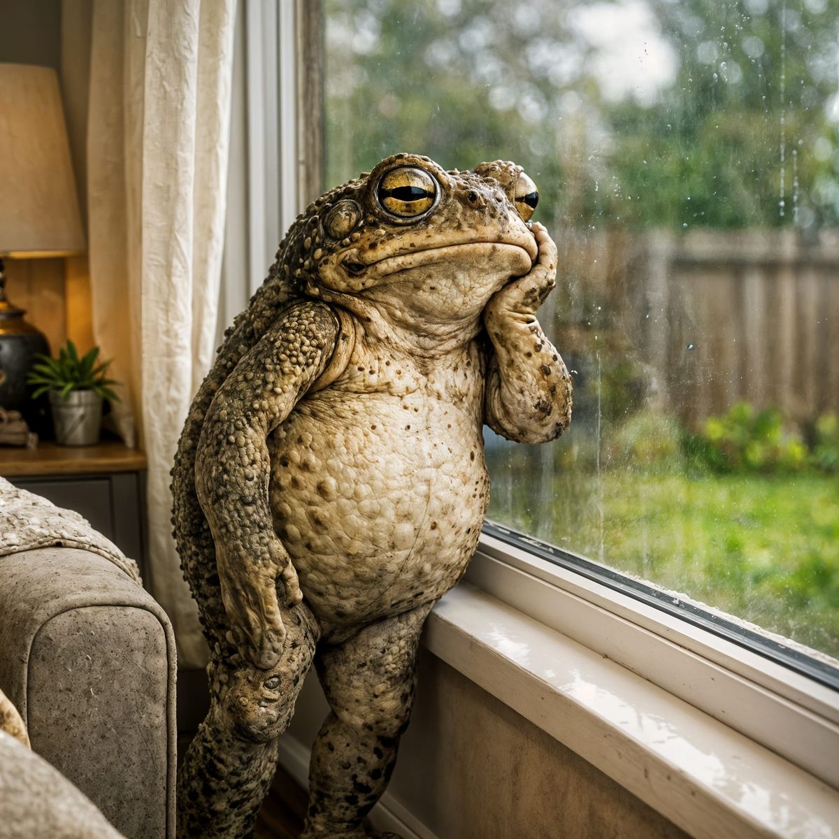 This image shows a toad standing upright and looking out of a living room window. It captures a moment of quiet contemplation from an amphibian's perspective.