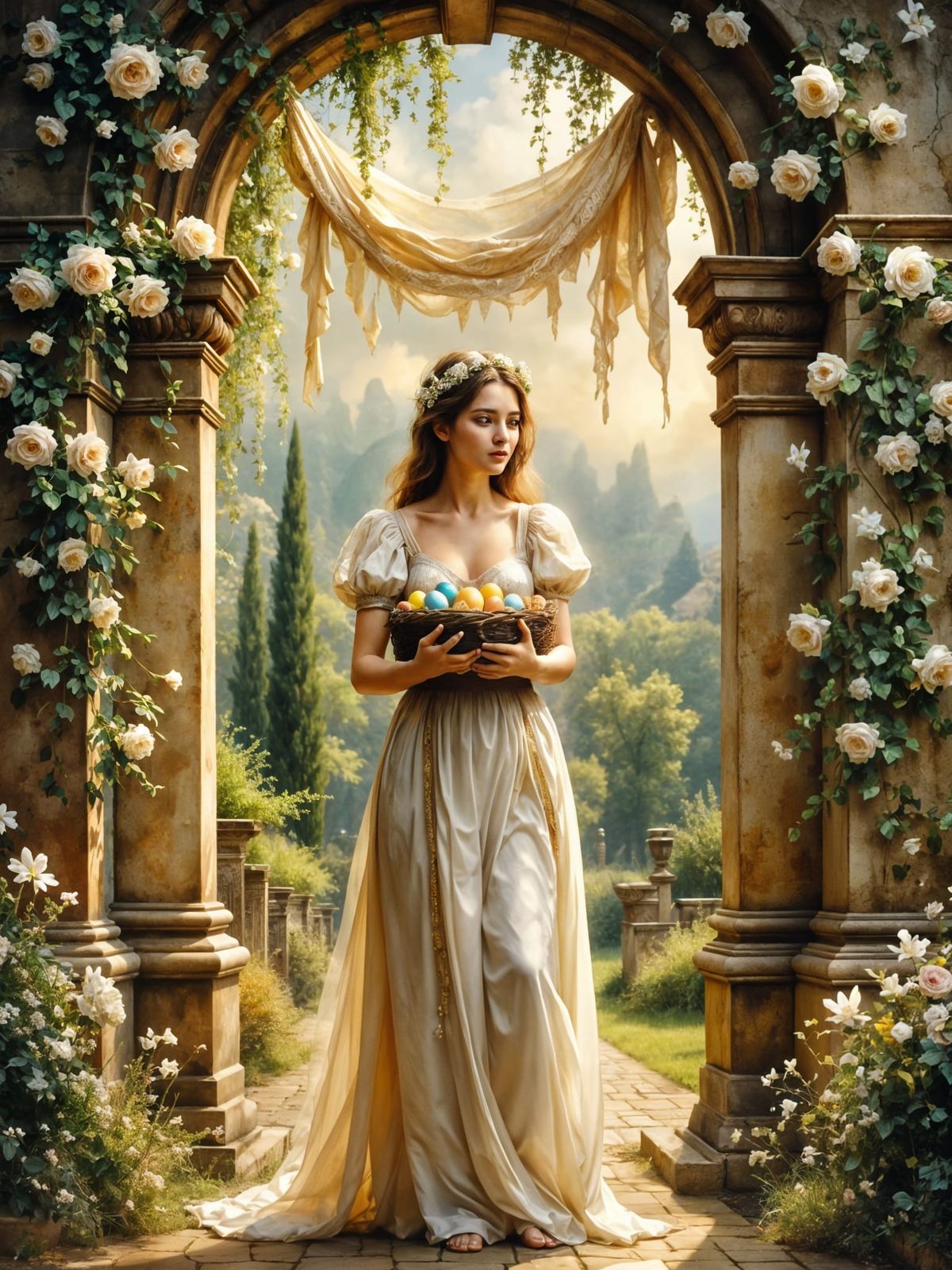 This image shows a luminous young woman in a High Renaissance style oil painting, celebrating Easter and an anniversary amidst blooming flowers and ornate eggs.