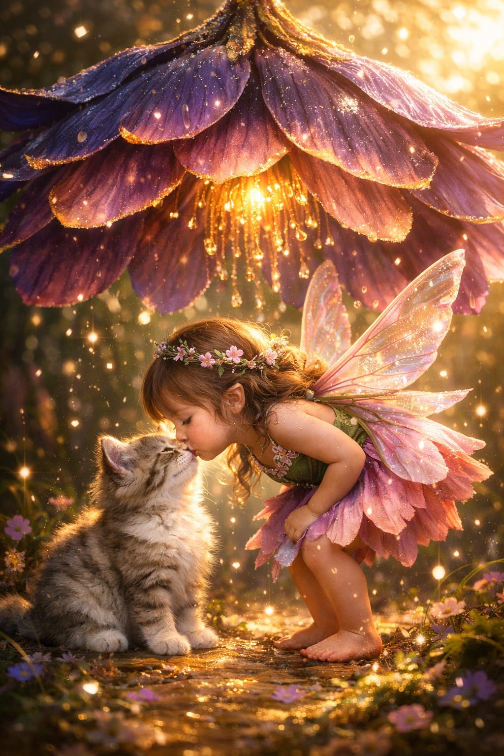 This digital art depicts a charming fairy gently kissing a fluffy kitten. A large, glowing flower shelters them, with sunlight and magical sparkles enhancing the scene.