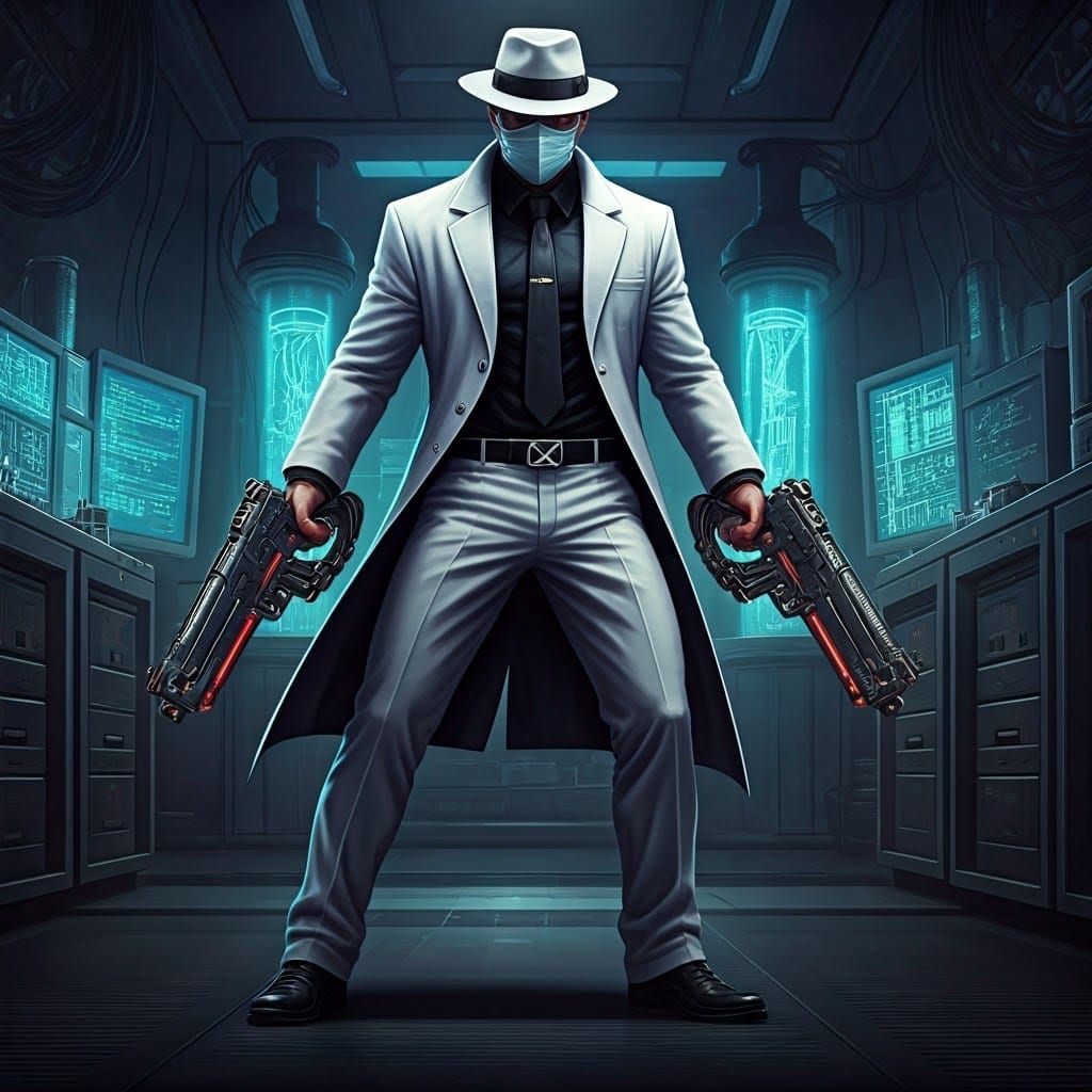 A striking image of Doctor Nemesis, dressed in crisp white and black, standing in a high-tech laboratory, armed with futuristic weapons and surrounded by vibrant lighting, evoking a sense of cutting-edge technology and high-stakes action.