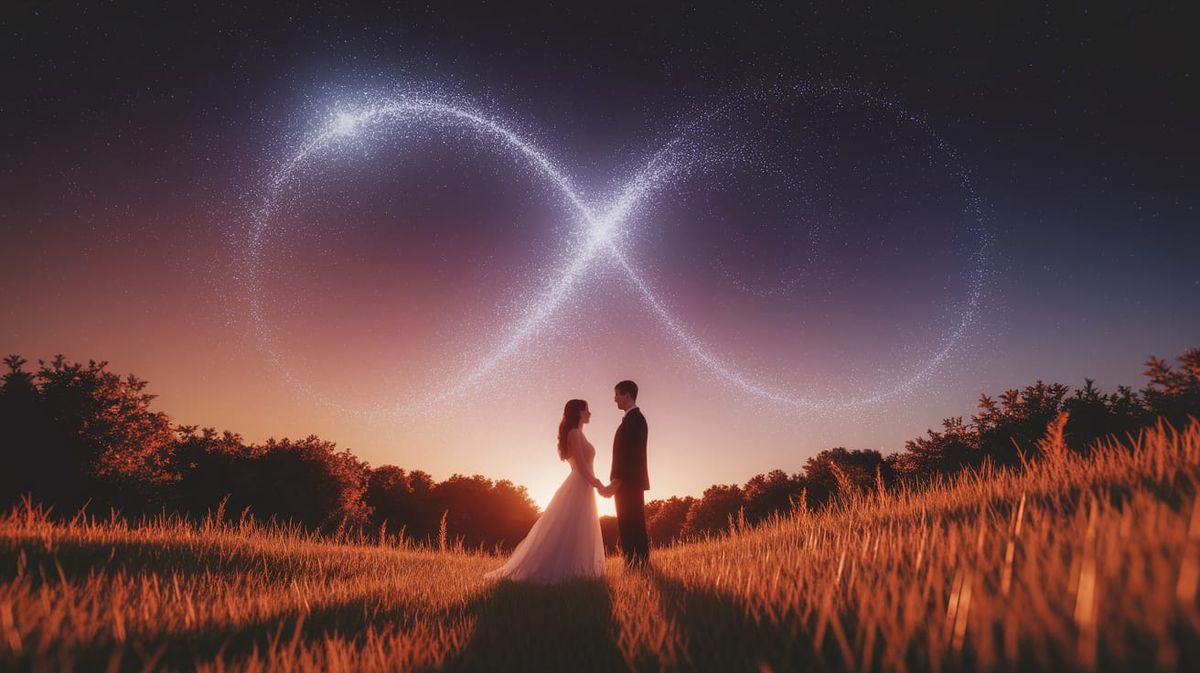 This enchanting 3D rendered image captures a tender couple standing hand-in-hand in a lush meadow, surrounded by a breathtaking figure eight formation of stars in the night sky. Warm hues and soft lighting create a gentle glow, casting intricate patterns of the starry sky.