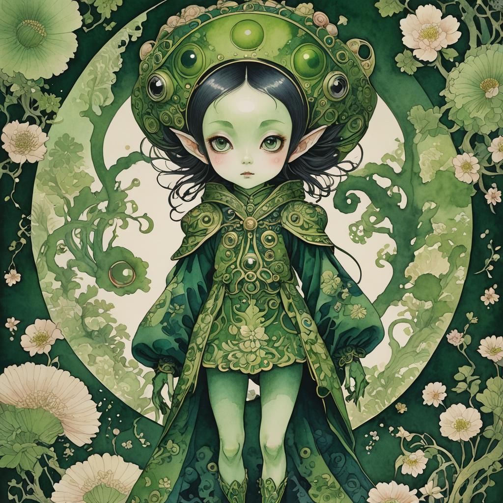This image shows the full silhouette of an alien girl with large eyes, depicted in a watercolor ukiyo-e style. The artwork features unique coloring, intricate details and a whimsical aesthetic.