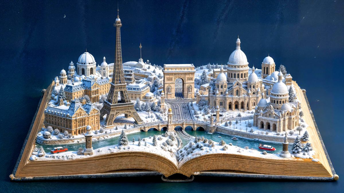 This hyper-detailed image showcases an antique book revealing a miniature, snow-covered Paris. Iconic landmarks like the Eiffel Tower and Louvre are intricately depicted in a fantasy concept art style.