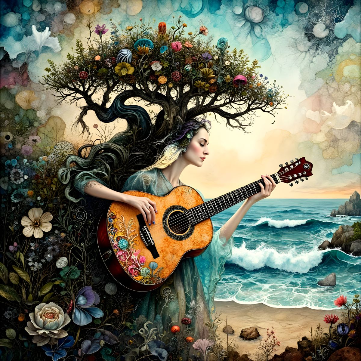 This image shows a stylized, windswept woman with a guitar beside a bonsai tree on a cliff overlooking the sea at sunset, featuring intricate fractal filigree and flowing organic forms.