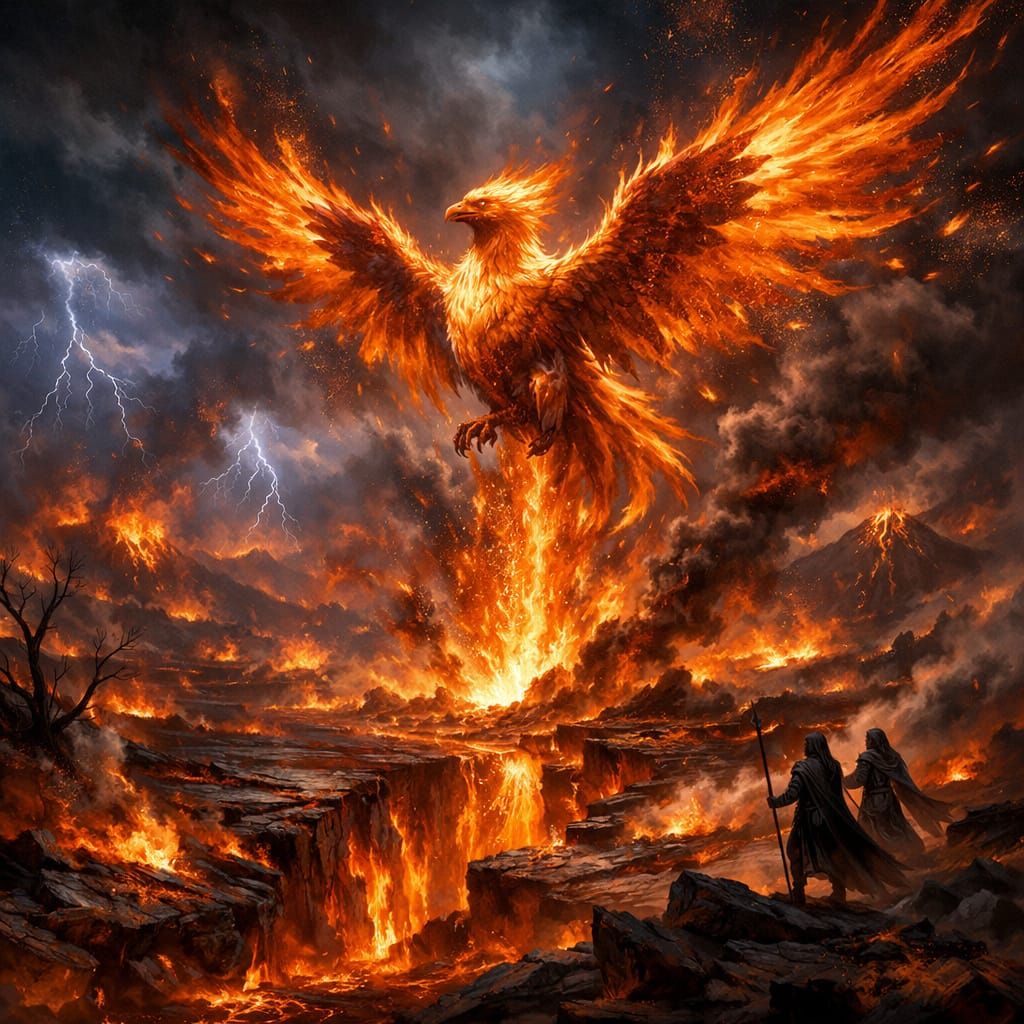 This image depicts the desolate Phlogaia plains, a volcanic landscape scarred by ancient battles. Ash-stained fields and glowing fissures suggest ongoing elemental fury, hinting at the legendary Ember Phoenix's domain.