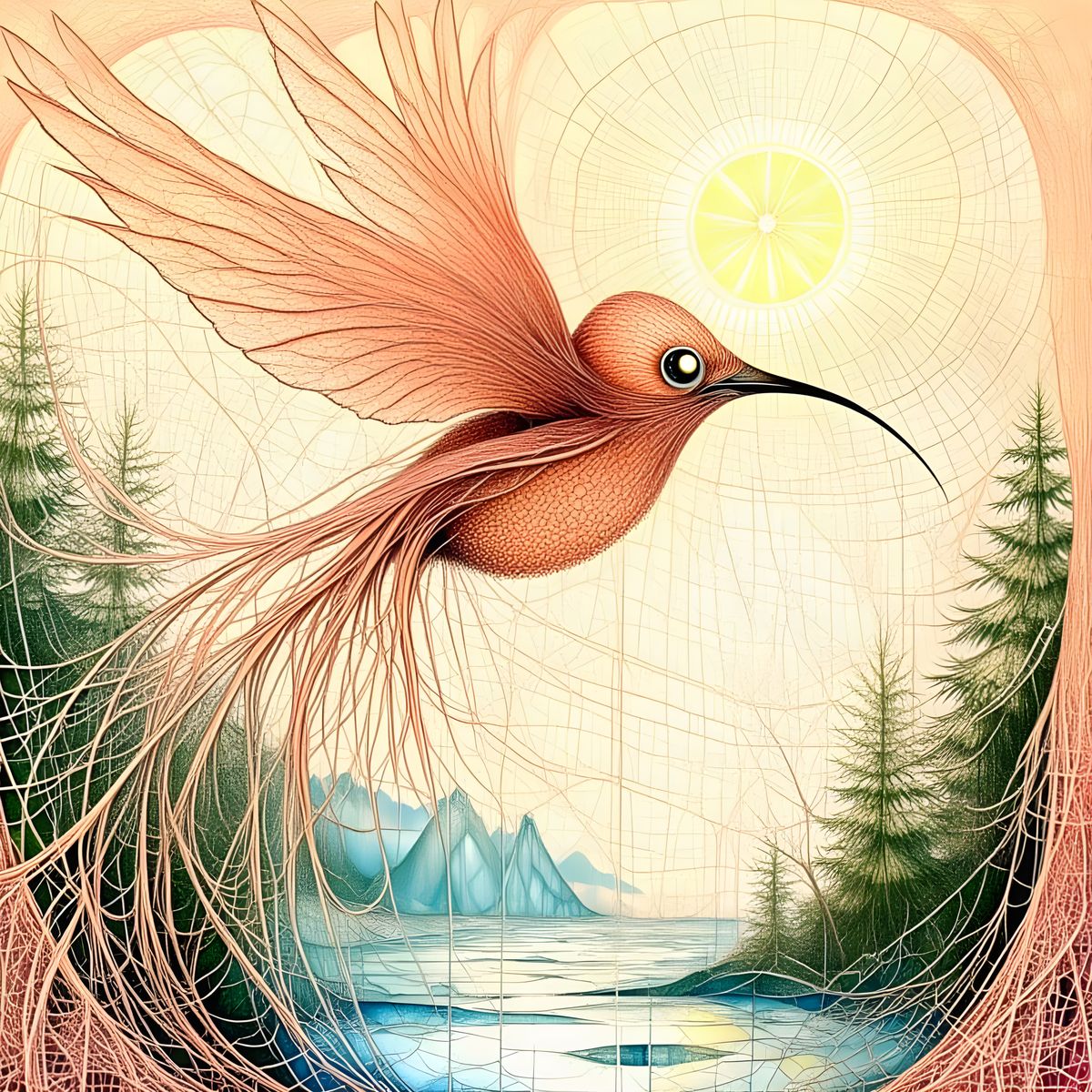 This image shows an intricately detailed, whimsical bird in flight, with a sun and trees also featuring roots. Abstract patterns and light rays create a unique visual.