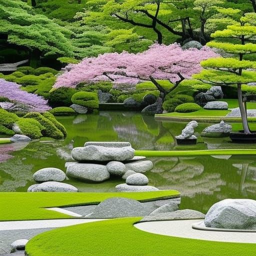 garden in full bloom, Japanese rock gardens, fountains, statues, garden benches, Ukiyo-e, soft colors, bokeh, woodcut