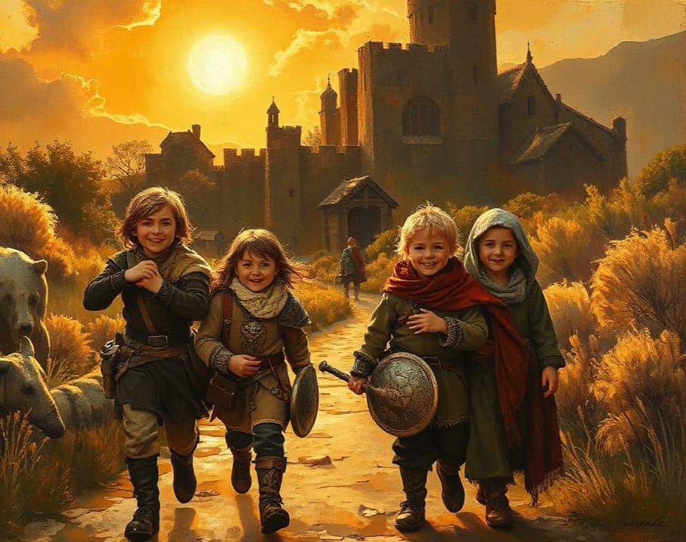 This image shows young adventurers returning to a medieval village with a vintage sepia effect. They carry treasure under a joyful, golden hour sun, evoking a sense of happy ending.