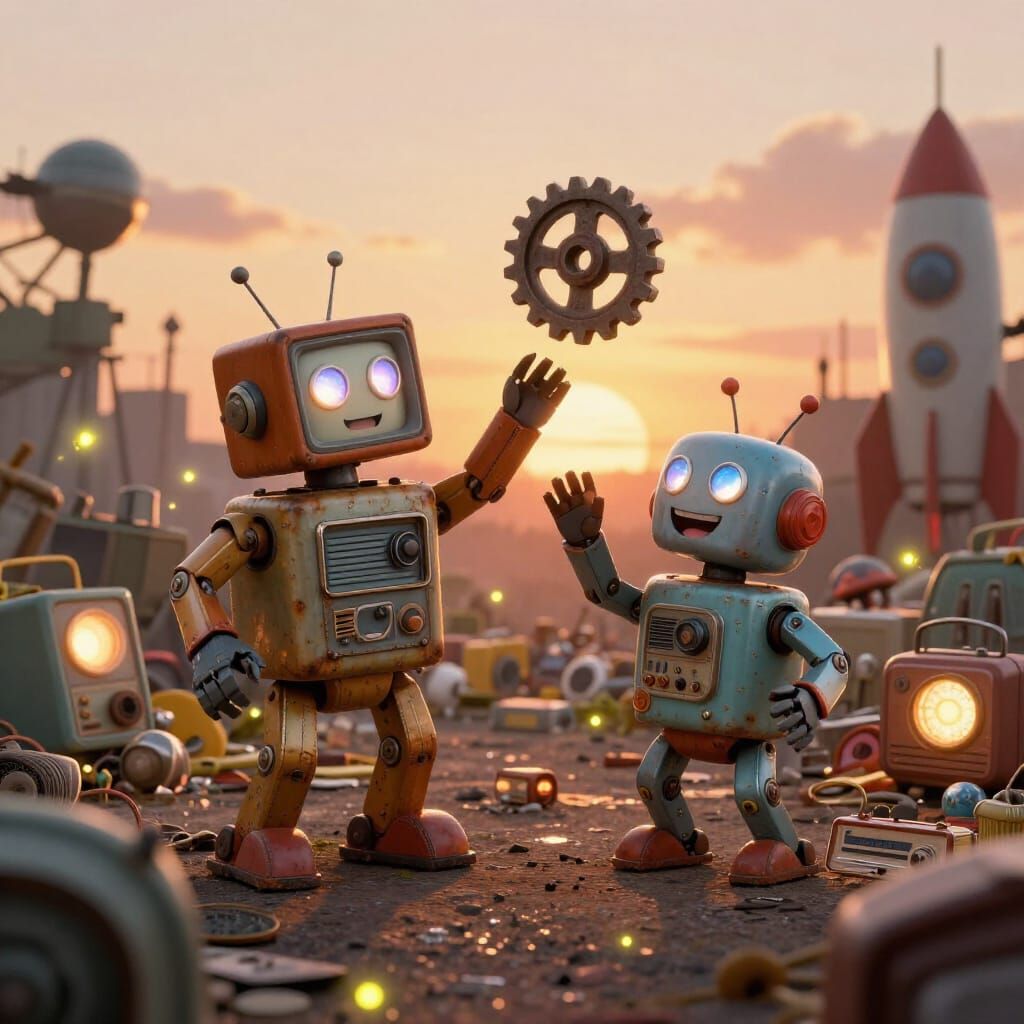 Two adorable, retro-style robots with round, glowing eyes and colorful, slightly rusted metal bodies play joyfully in a sprawling junkyard under a golden sunset. One robot, with a boxy television-shaped head, tosses an old gear like a frisbee, while the other, a smaller, round-bodied bot with antennae, giggles and tries to catch it with little claw-like hands. Scattered around them are piles of vintage gadgets, blinking lights, and old rocket parts, creating a playground of forgotten technology. Fireflies flicker in the warm evening air, and a tiny radio crackles with a cheerful, jazzy tune as the two robots enjoy their whimsical world of scrap and imagination.