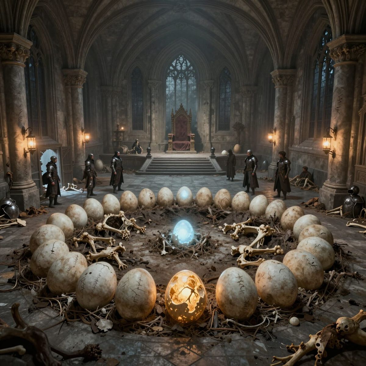This dark fantasy concept art depicts a once-grand fortress hall, now a nesting ground for a large predator. Evidence of its habitation, including debris and scratch marks, overlays the noble architecture.