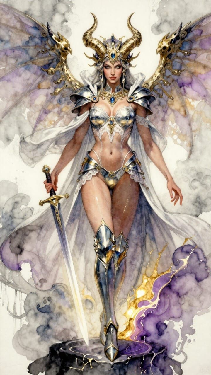 This image depicts a massive warrior queen in a scandalous fusion of white lace and chrome bikini armor. A diaphanous cape billows behind her, with a headdress of gilded horns and jewels.