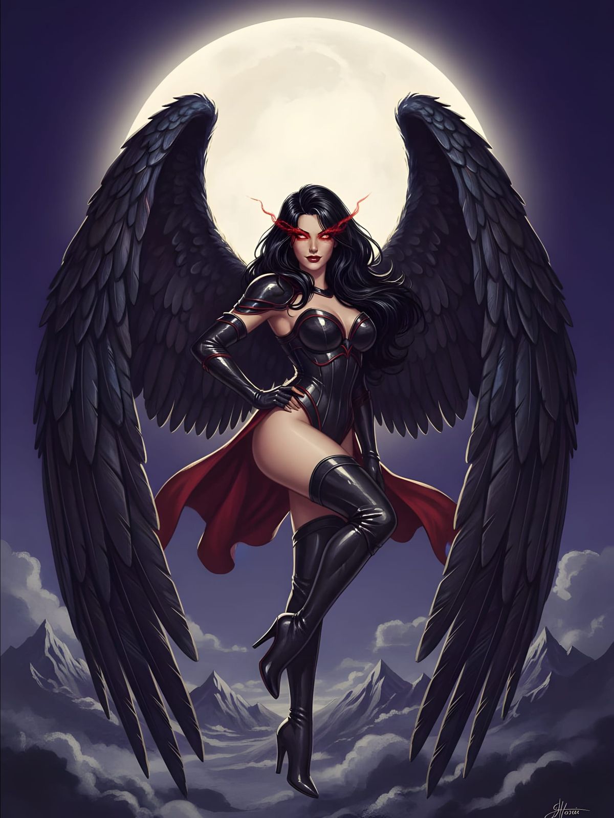 A glamorous fallen archangel poses sensually against a full moon in a striking retro pin-up illustration. Features include black feathered wings, armored attire, and captivating red eyes.