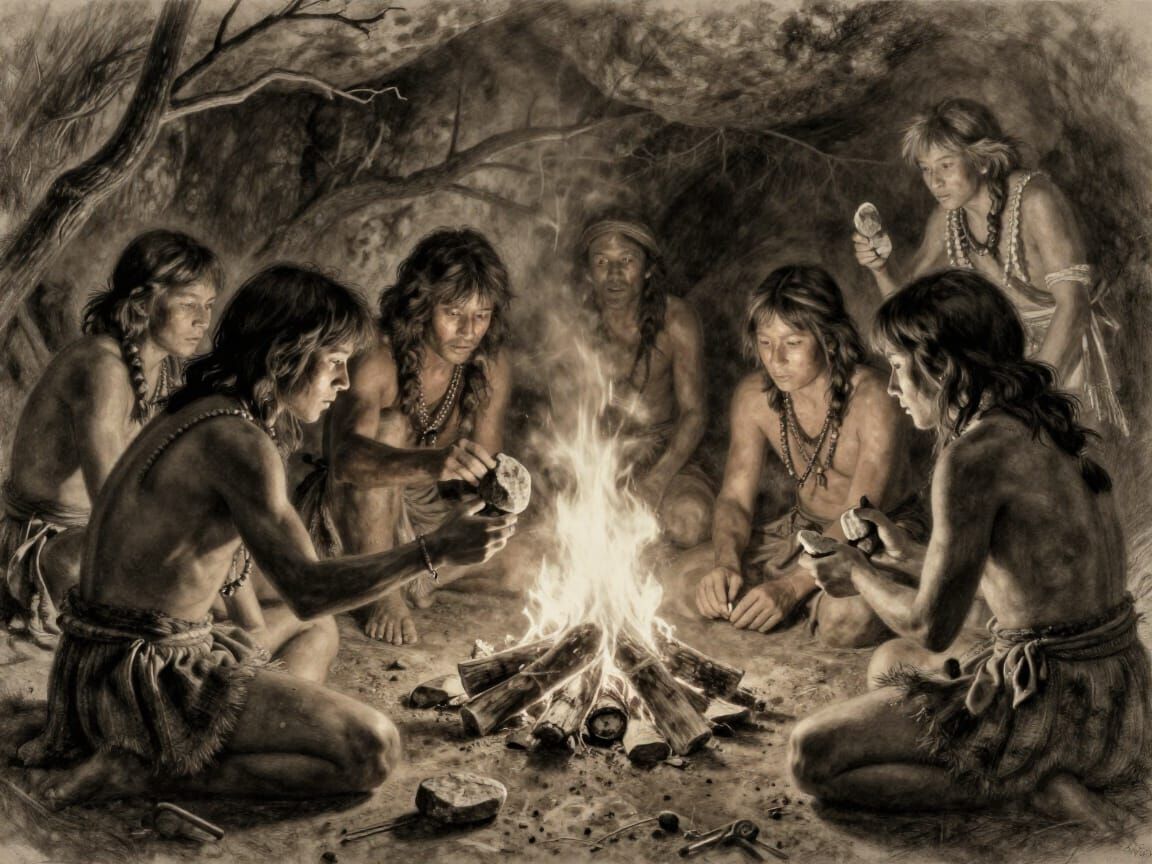 This image depicts early humans around a fire, demonstrating tool-making and food preparation. Rendered with hyperrealistic detail and charcoal sketch textures, it evokes primitive art and survival.