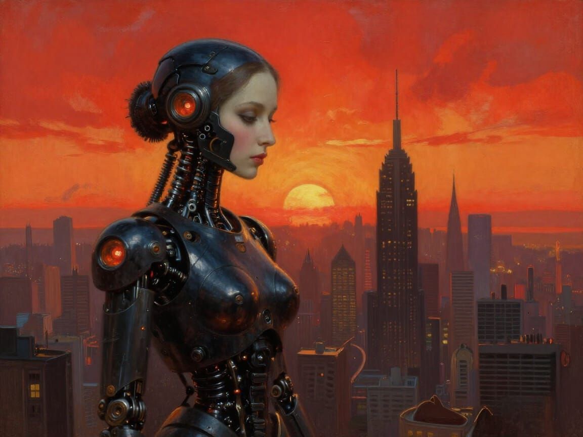 This image shows a full body depiction of a detailed robot in a dark city during a red dawn. It is rendered in a hyperdetailed academic art style with a photorealistic finish.