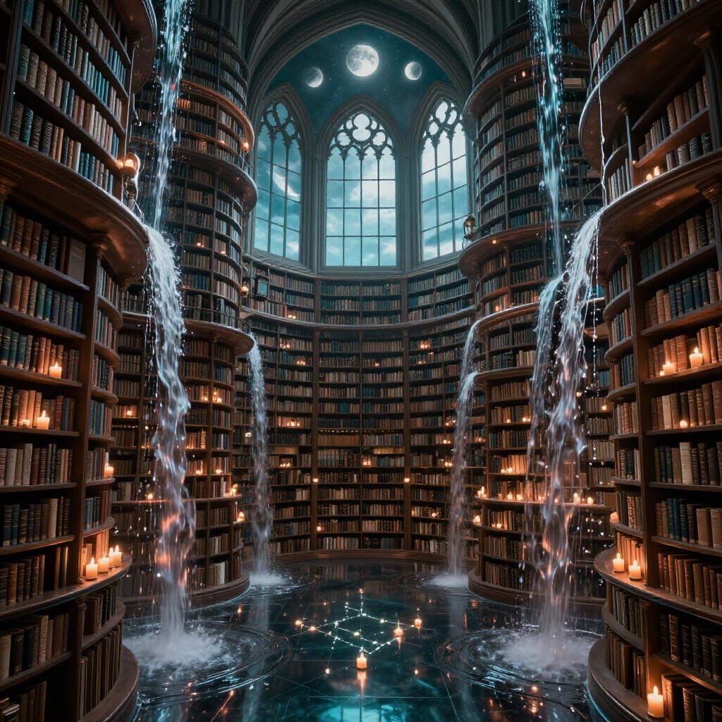 A majestic, dreamlike library with floating bookshelves in zero-gravity. Mercury waterfalls flow upward between aisles, beneath Gothic windows showing three moons. Polished dark floors reflect floating candles.