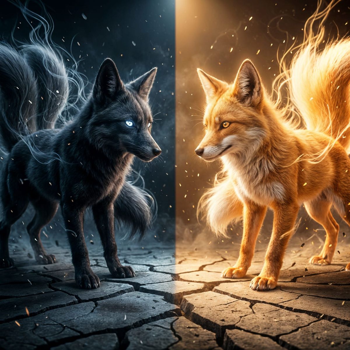 This ultra-photorealistic cinematic image shows a viewer's perspective between two powerful Kitsune, one dark and shadowy, the other luminous and bright, in a tense standoff.