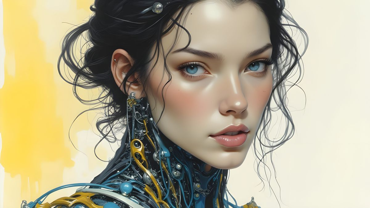 This hyperdetailed image shows a beautiful cyborg with organic features and subtle, artistic metallic accents. The art style blends precisionism and synthetism with volumetric lighting for a captivating, otherworldly aesthetic.