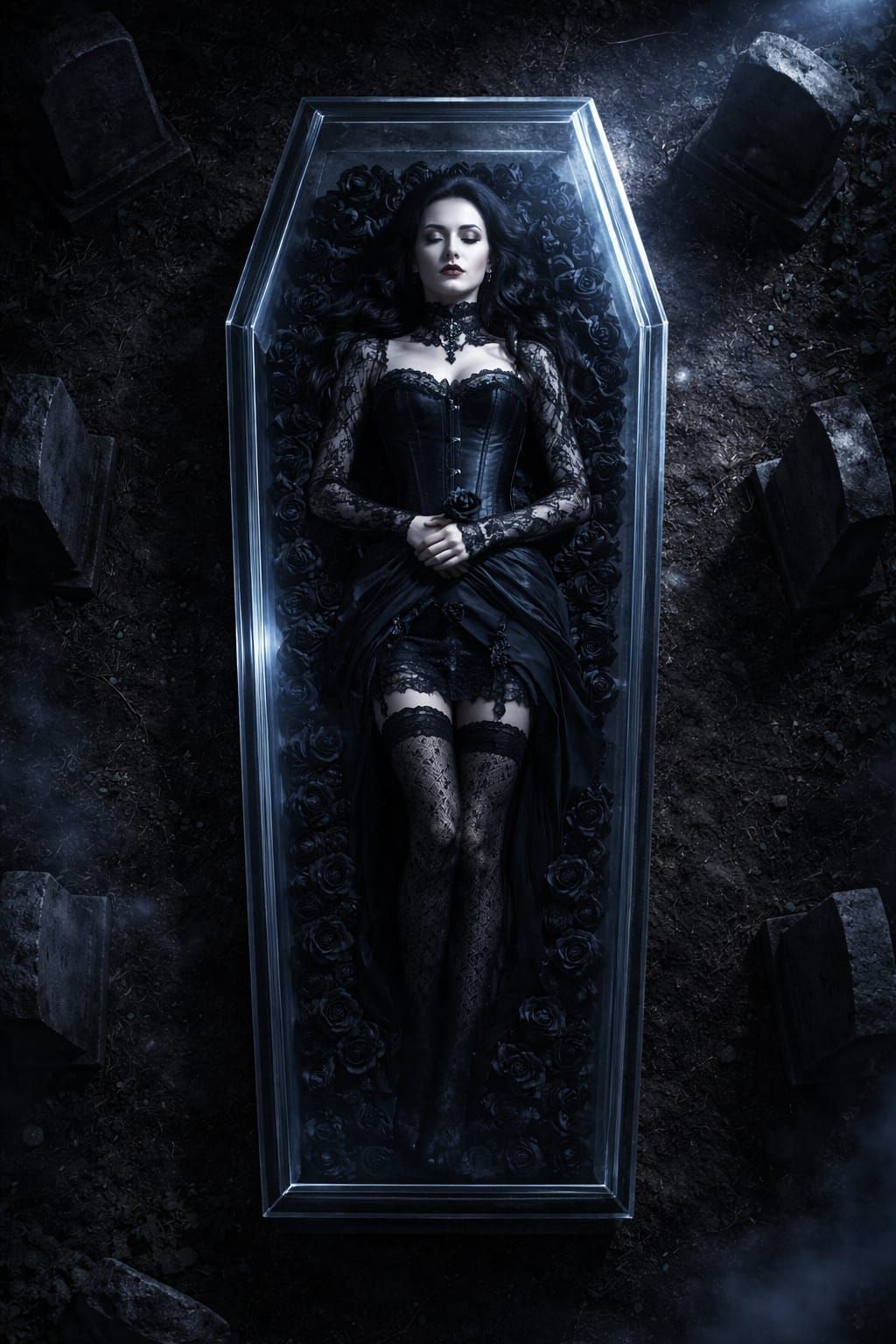 A serene goth woman rests in a glass casket within a moonlit graveyard. The scene features black roses, dramatic shadows, and a palette of deep blacks and muted grays, evoking a haunting stillness.