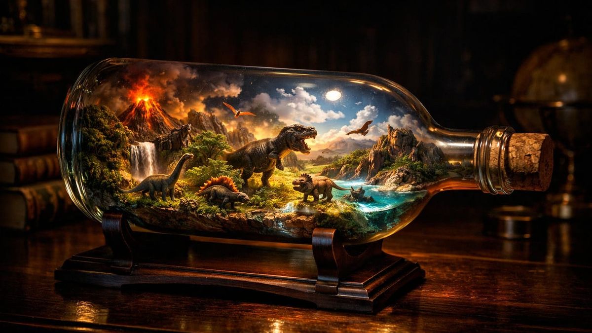 This image showcases a glowing wine bottle containing a detailed, self-contained Jurassic ecosystem with dinosaurs. Dramatic lighting emanates from within the bottle, illuminating a dark study.