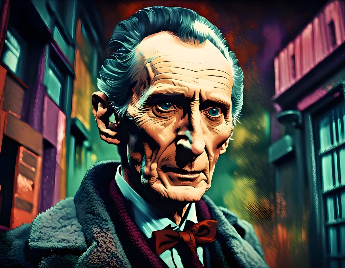 A striking image of Peter Cushing as Doctor Who in a gritty, urbancore style. The portrait features bold colors, grainy film effects, and intricate details, reminiscent of raw street photography.