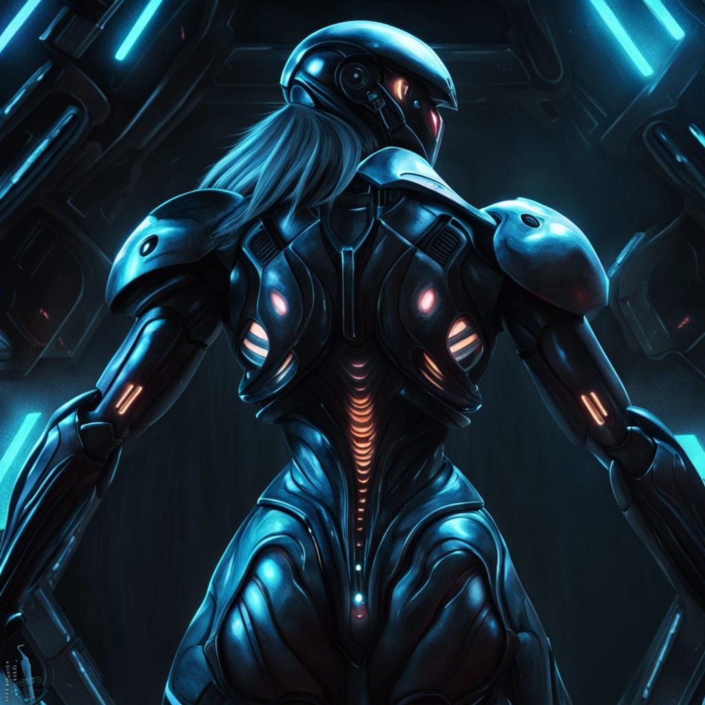 This image shows Dark Samus in hyperrealistic detail against a sci-fi spaceship interior. The artwork presents a slim figure in a high-detail, futuristic environment.
