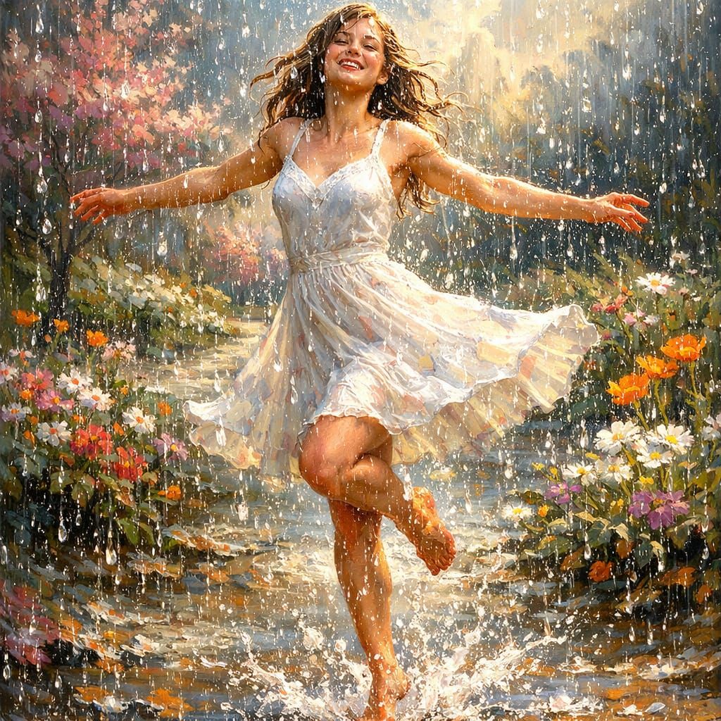 This image shows a happy young woman dancing in a light spring rain. The painting uses impasto technique and vibrant colors for a dramatic, hyperdetailed effect.