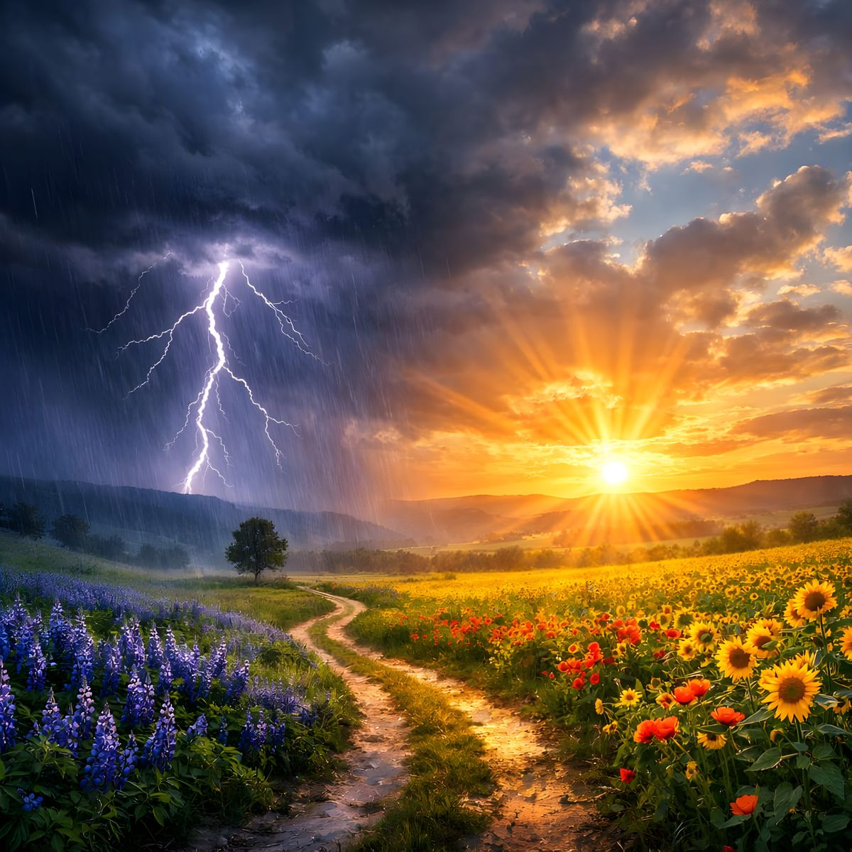 This image shows a landscape with a thunderstorm and sunshine rays, featuring contrasting cool and warm colors. A beautiful depiction of spring weather.