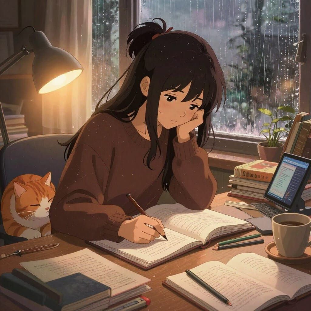 This image shows a lofi-style illustration of a focused student with a cat, studying at a desk with rain outside. Features a warm, gentle glow and muted colors.