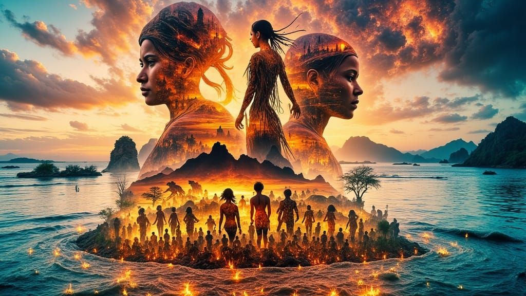 A vivid aboriginal dancer double exposure over a panorama of Oceania: Uluru Rock in Australia, surfing koalas, emus from Australia, Samoan fire dancers, brown crabs from Micronesia, traditional Tuvalu dancers, the island of Tuvalu with rising water, and the words "Save Tuvalu"<lora:Abstract Reality:1.0> ...