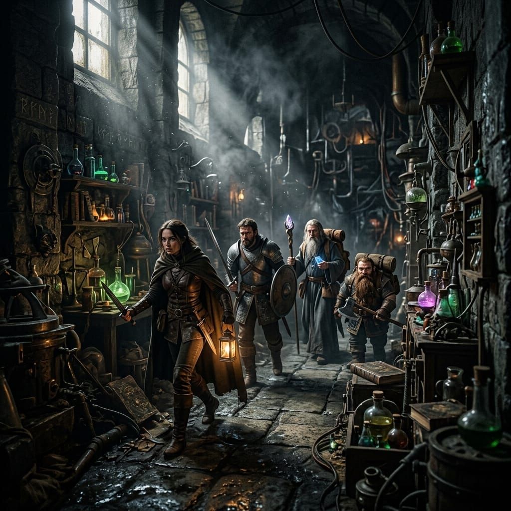 This photo-realistic image shows adventurers in a dimly lit wizard's laboratory, navigating treacherous passages. Volumetric lighting and a shallow depth of field create an intense, hyperdetailed atmosphere.