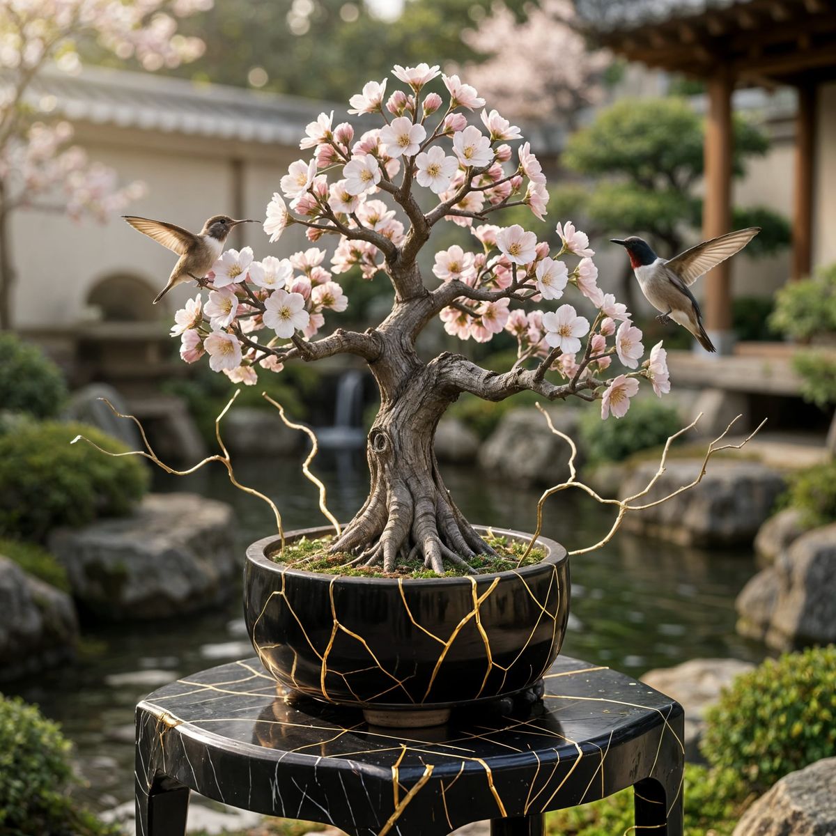 This detailed image shows a lone hummingbird amidst the blossoms of a small bonsai tree. The bonsai rests in a black kintsugi-style ceramic pot, displayed on a black marble stand with gold accents.