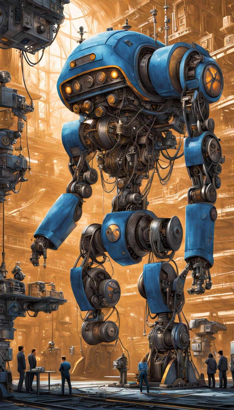 This highly detailed digital painting shows a small figure directing a massive robot with a blueprint. Features intricate gears, polished metal, and dramatic lighting, presented in sharp focus.