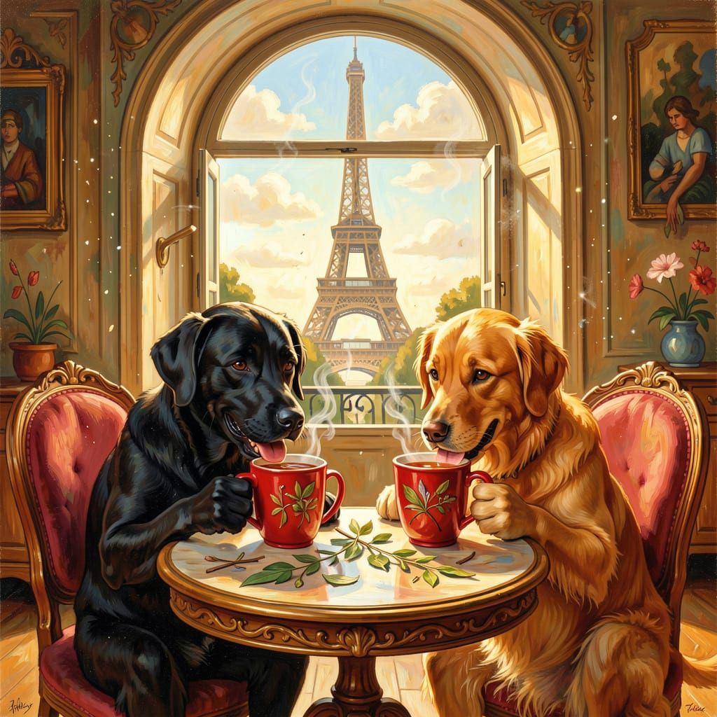This image shows two happy dogs, a black lab and a golden retriever, enjoying tea at a table in a sunlit Parisian apartment. The scene is rendered with a painterly, surreal quality, reminiscent of Magritte and Varo.