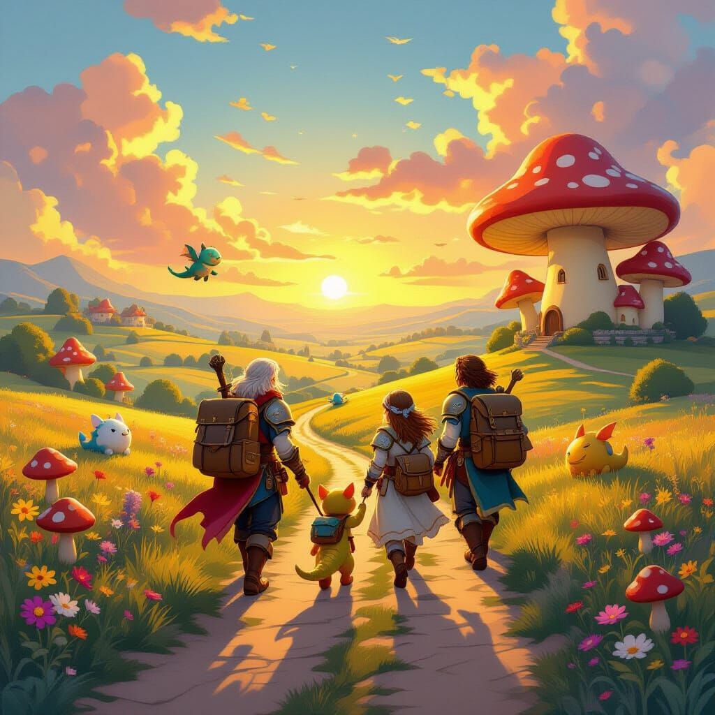 This image shows cheerful adventurers returning home on a winding path under a golden sunset. Playful creatures and oversized mushrooms accompany them in a lighthearted, magical fantasy world.