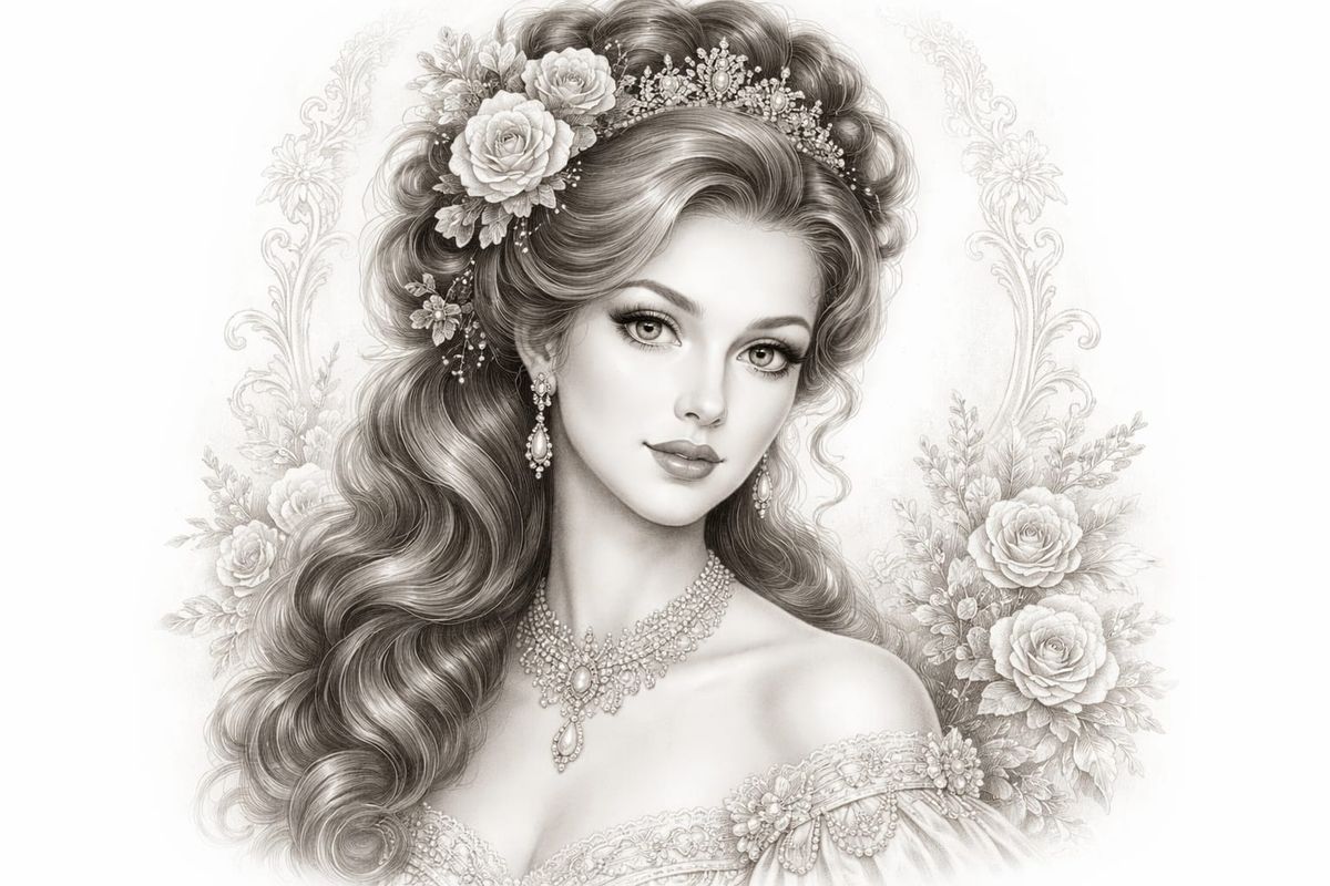 A detailed black and white illustration of a Victorian lady, capturing the elegant aesthetic of classic Breck shampoo advertisements with ornate features.