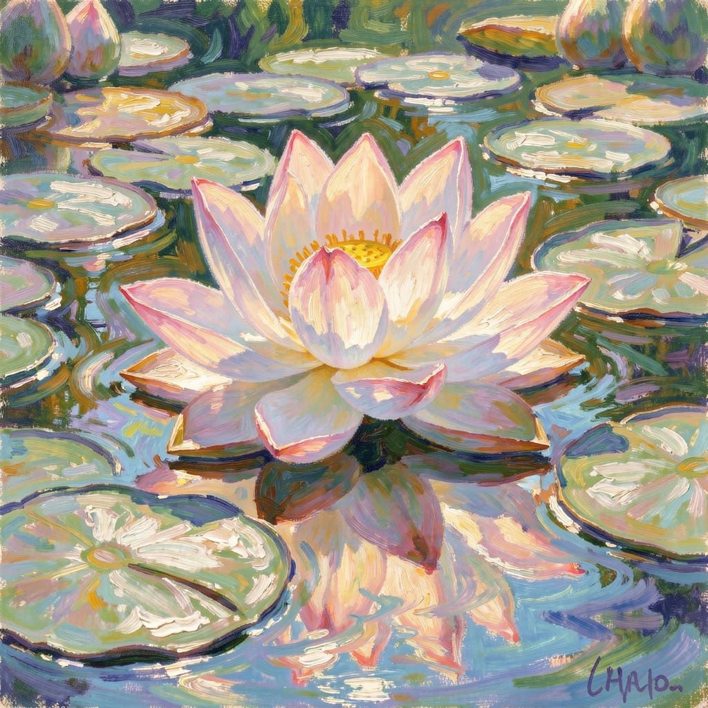 This image is a Monet-style oil painting of a serene lotus flower in a tranquil pond. Loose brushstrokes and vibrant colors capture the impressionistic essence of dappled sunlight on water.